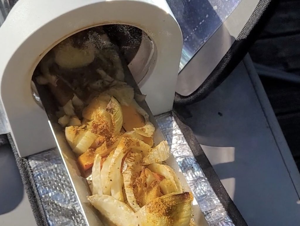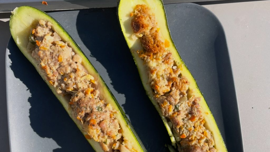 Nouvelle expérience solaire réussie : des courgettes farcies maison cuites entièrement au four solaire tube ! J’ai coupé la courgette