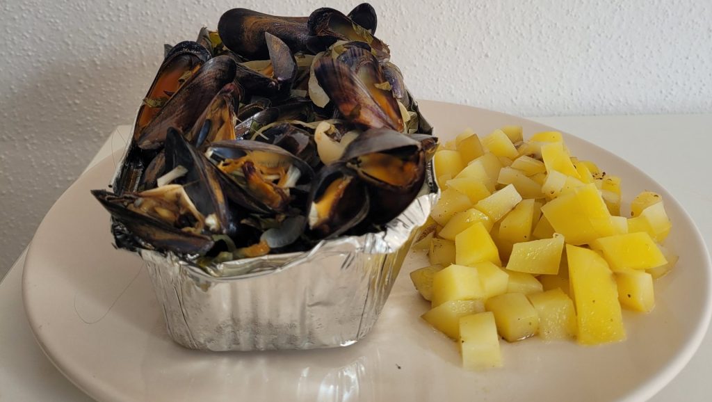 Aujourd’hui, j’ai tenté une recette un peu originale : des moules avec des pommes de terre, cuites entièrement au four