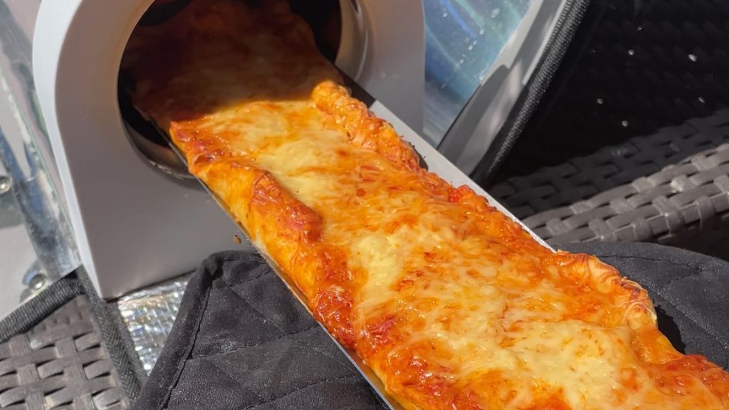 Aujourd’hui, j’ai testé la pizza au four solaire tube ! Une pâte maison toute simple (eau, farine, levure), un peu